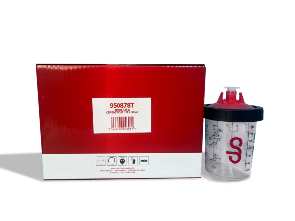 Vaso desechable de preparación, mezcla y aplicación. Filtro integrado de 125 µ para pinturas y barnices al agua y al disolvente. Sistema sellado que permite pintar incluso al revés. Se puede almacenar la pintura en su propio depósito.